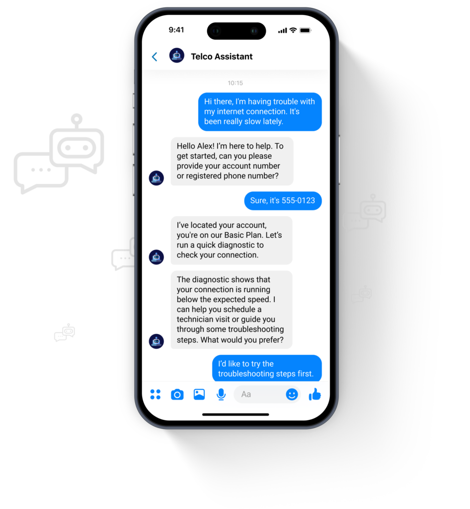 An AI-powered virtual assistant that handles over 40 customer service tasks, including bill payments and device upgrades.